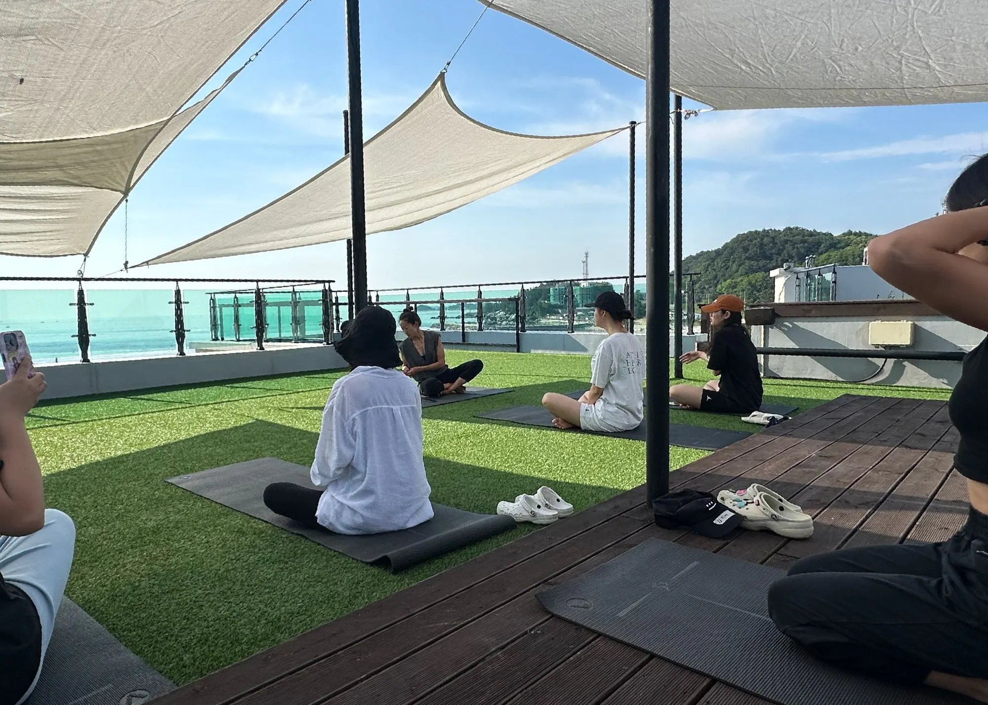 먼저 요가 클래스입니다! 책상 위에서 시간을 많이 보내는 워커들의 웅크렸던 몸과 마음을 위한 힐링 프로그램인데요. 몸과 마음의 활기를 되찾을 수 있도록 도와주는 요가 클래스는 다시 일상으로 돌아갔을 때도 새로운 활력과 생각으로 나를 채워나갈 수 있는 너무 좋았던 프로그램입니다. 저희 크루들은 다 같이 아침 수업을 들었는데요. 졸린 몸을 이끌고 수업 장소인 스테이 건물 루프탑에 올라왔더니 해가 뜨는 인구 해변의 환상적인 뷰를 볼 수 있었습니다.