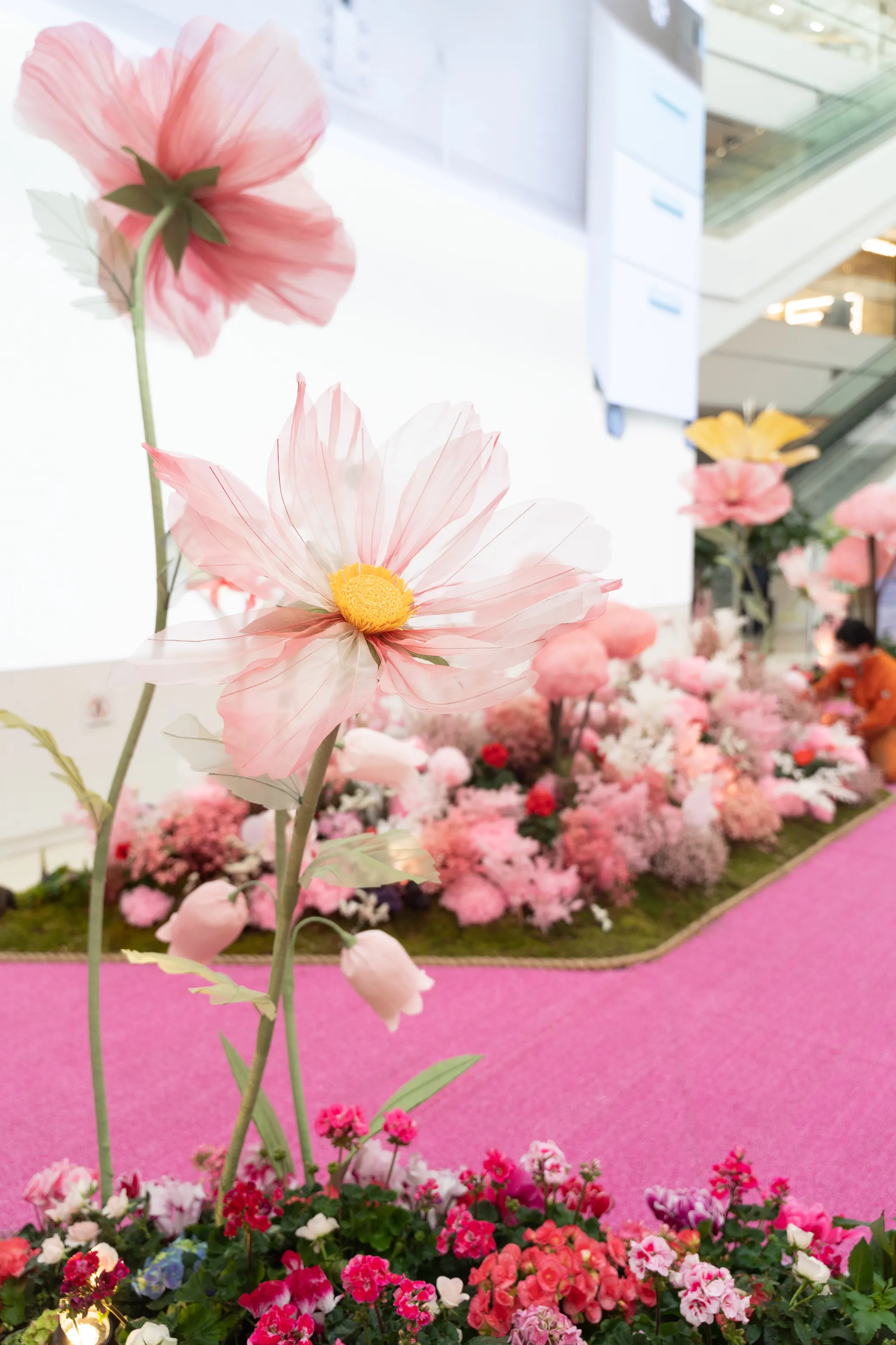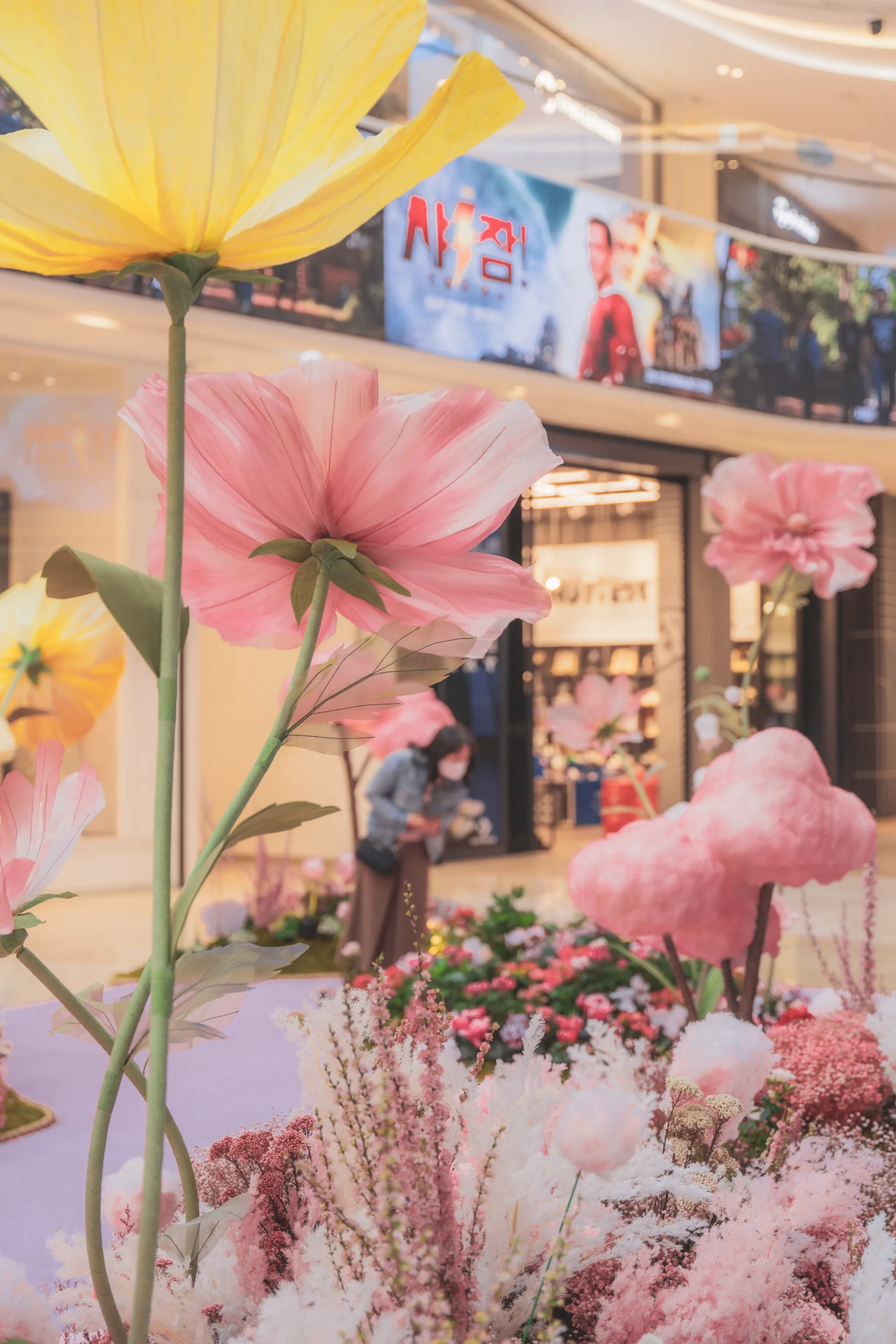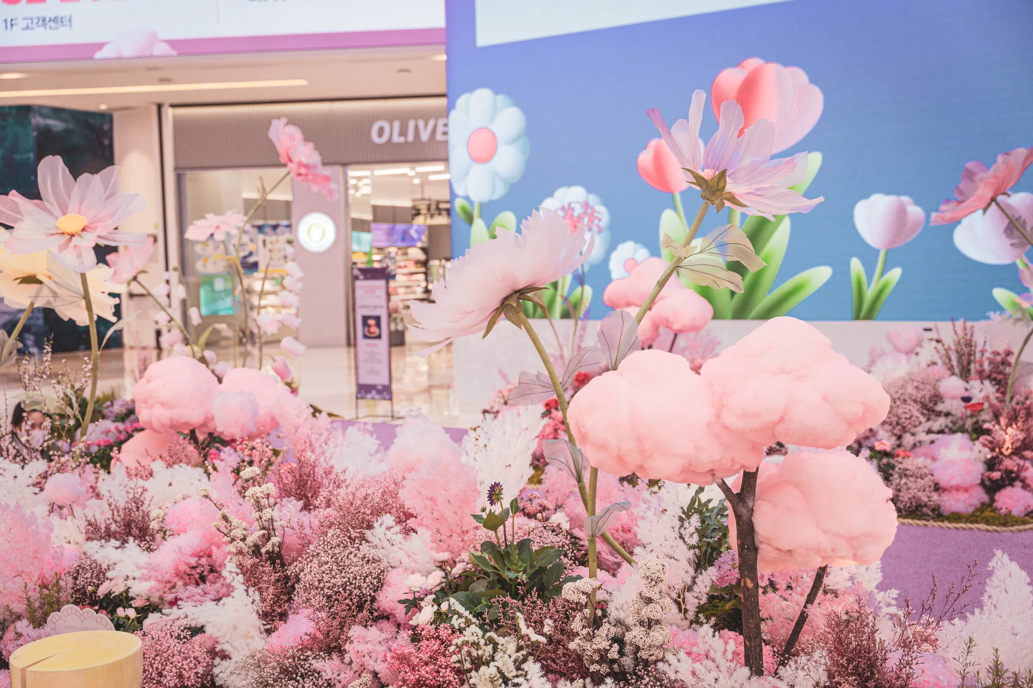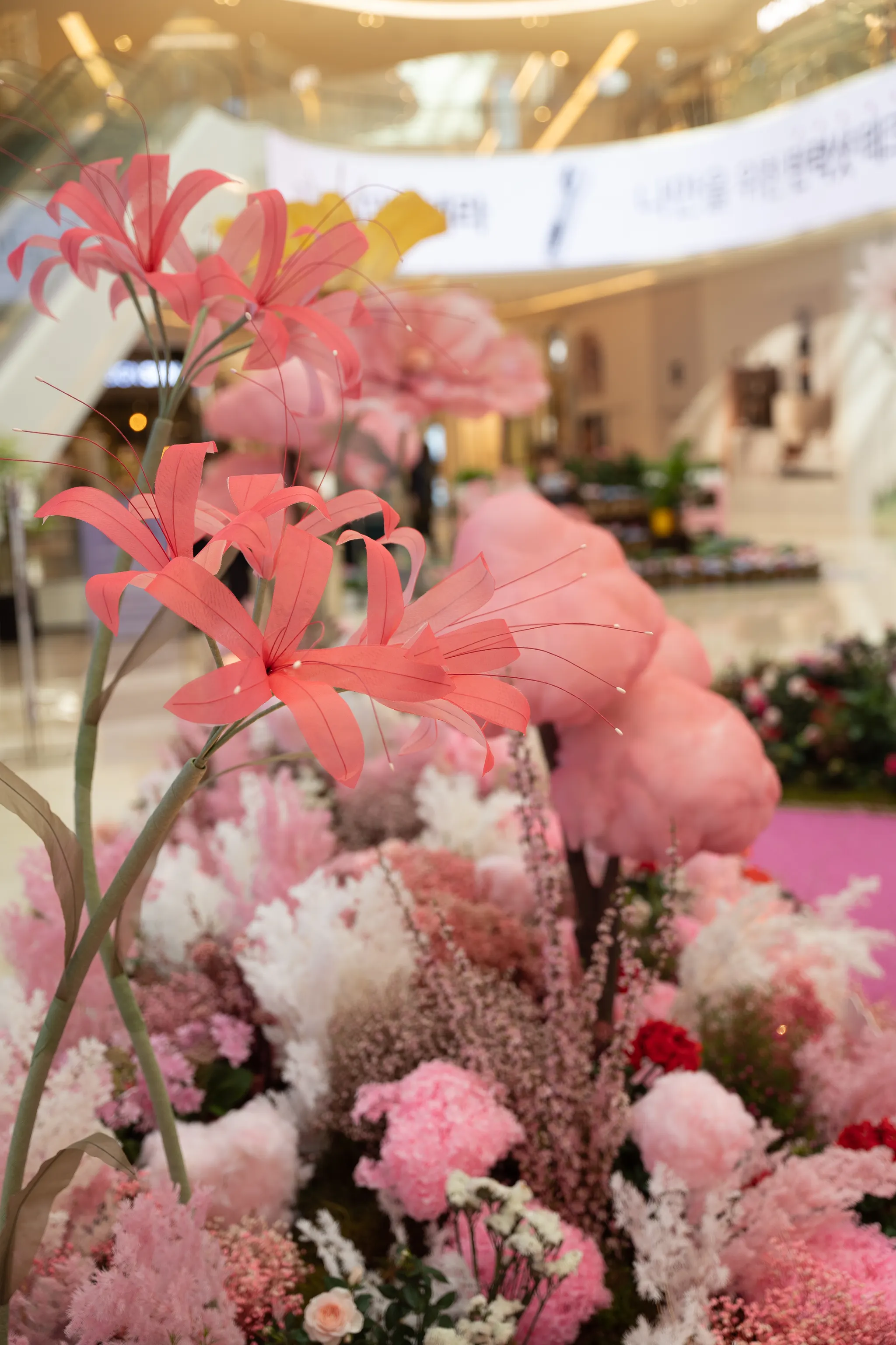 봄의 생동감과 행복함을 느낄 수 있는 ‘핑크’컬러를 모티브로, 다채로운 봄꽃과 더불어 실내에서 느끼는 신비한 무드로 WOW 요소를 넣어, 창의적인 전시공간을 구성하였습니다.