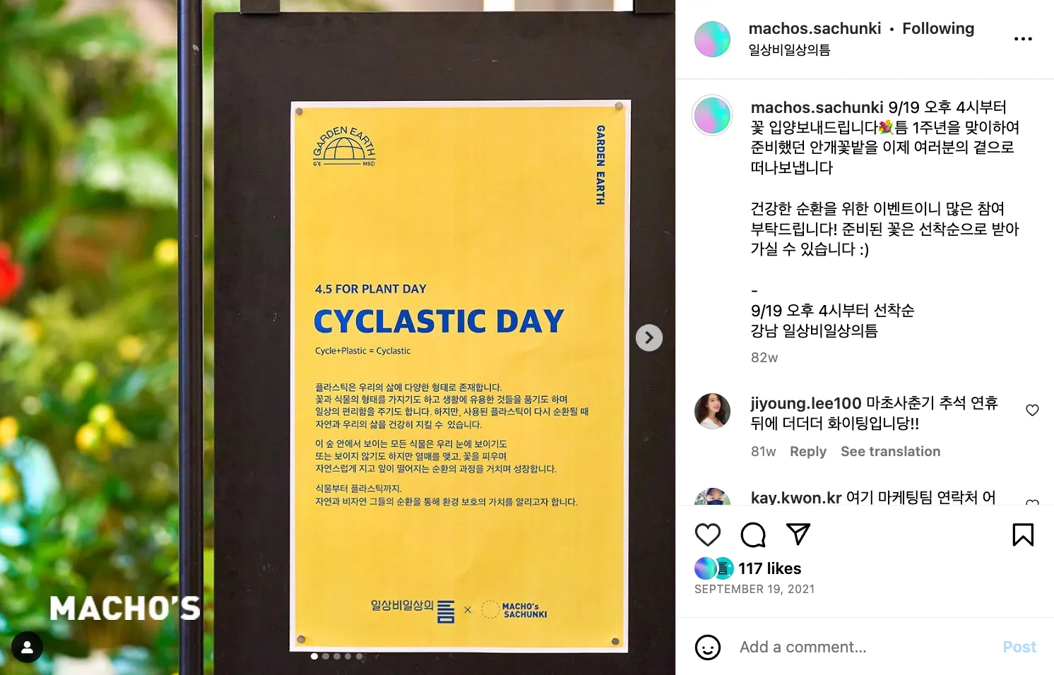 연출에 사용된 모든 꽃은 방문객에게 모두 선물로 제공했습니다. 마초의사춘기는 단순 연출 이상으로, 순환과 재활용의 가치를 만들기 위해 노력합니다.