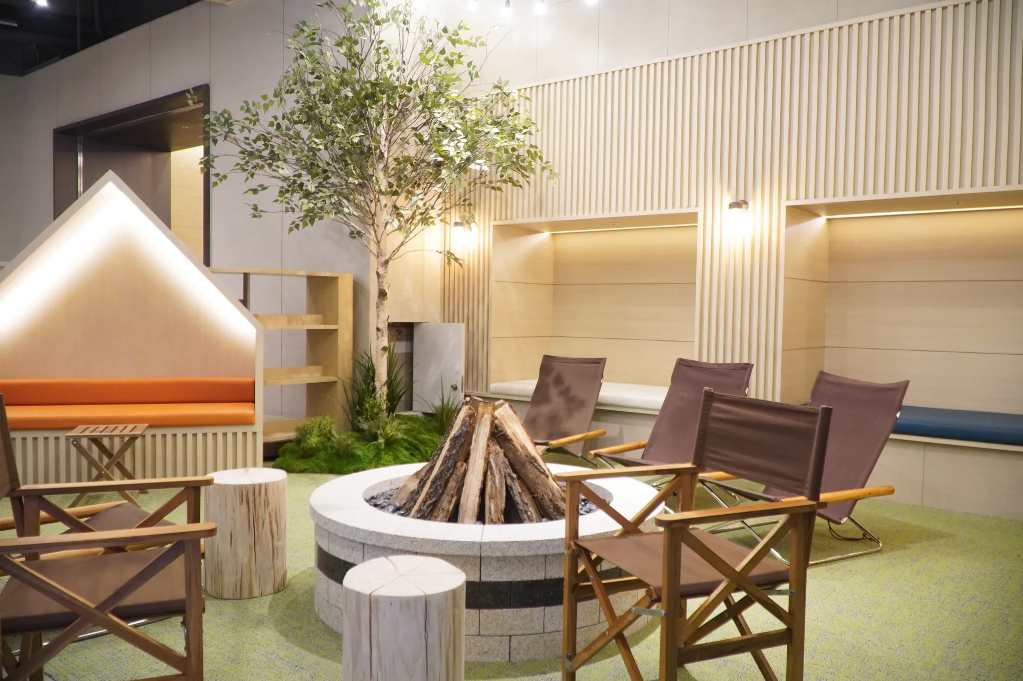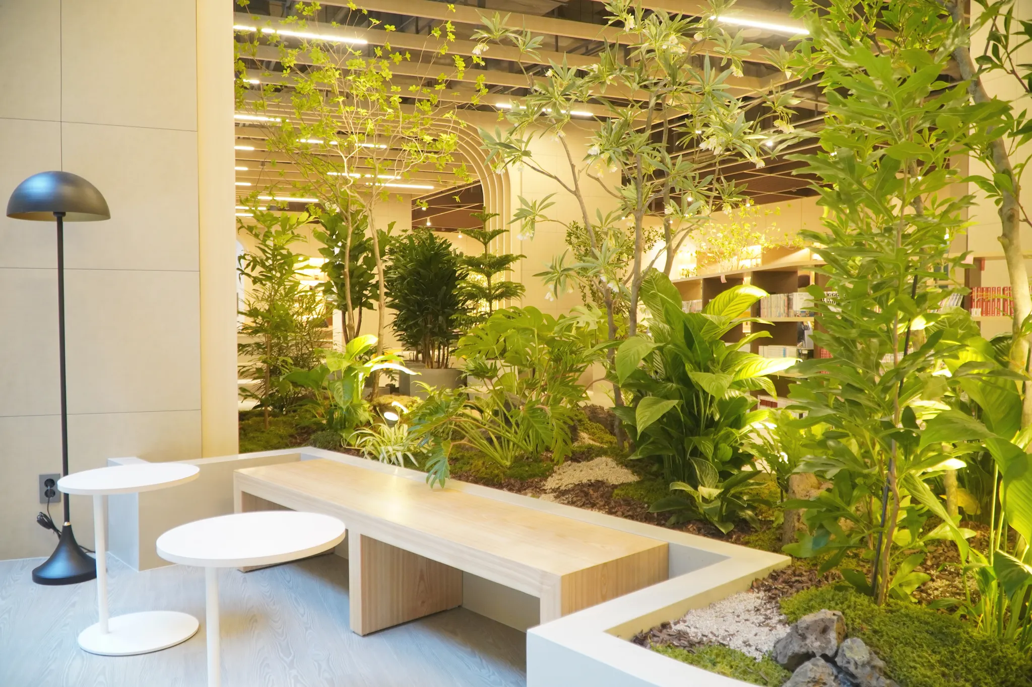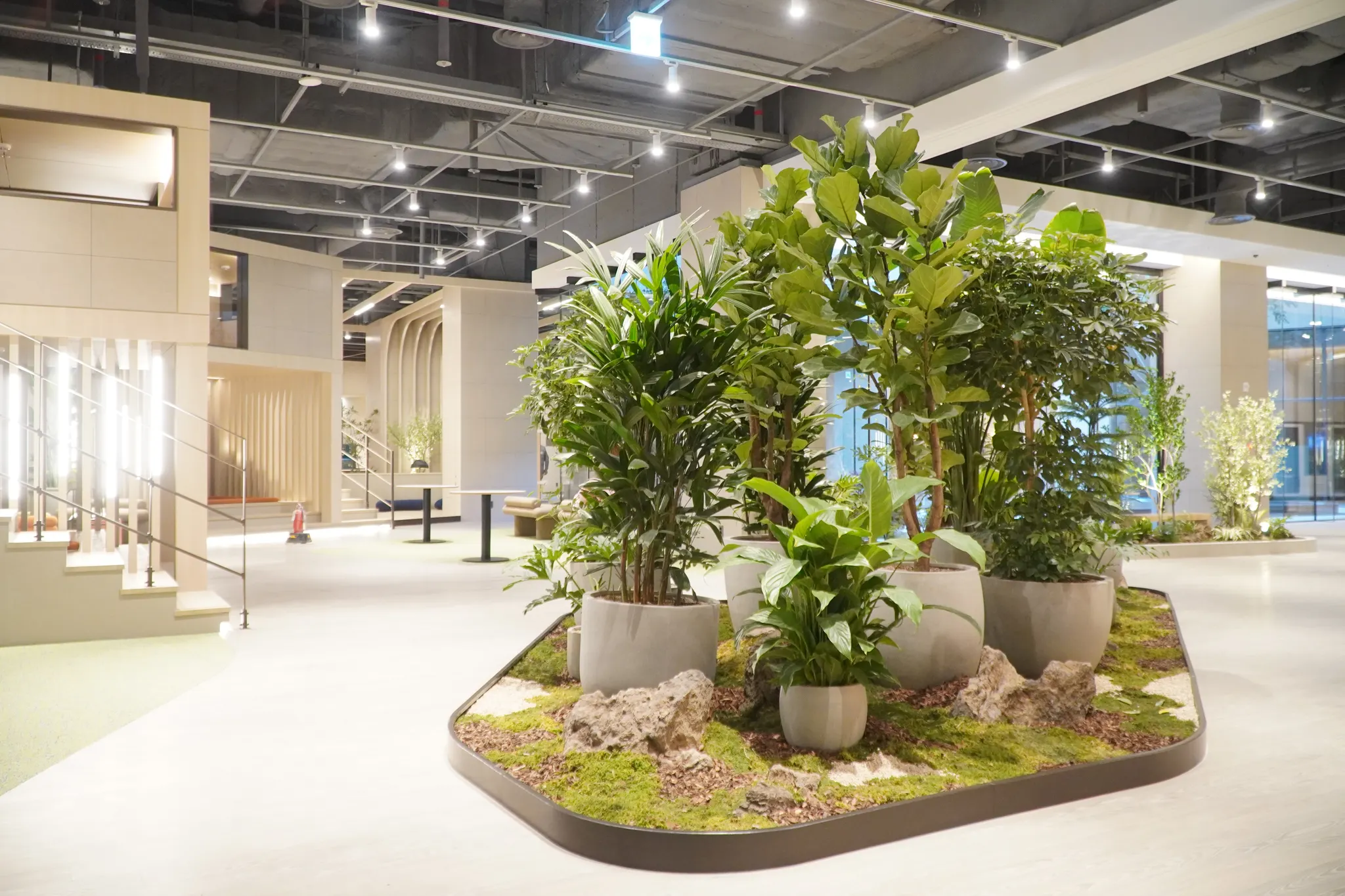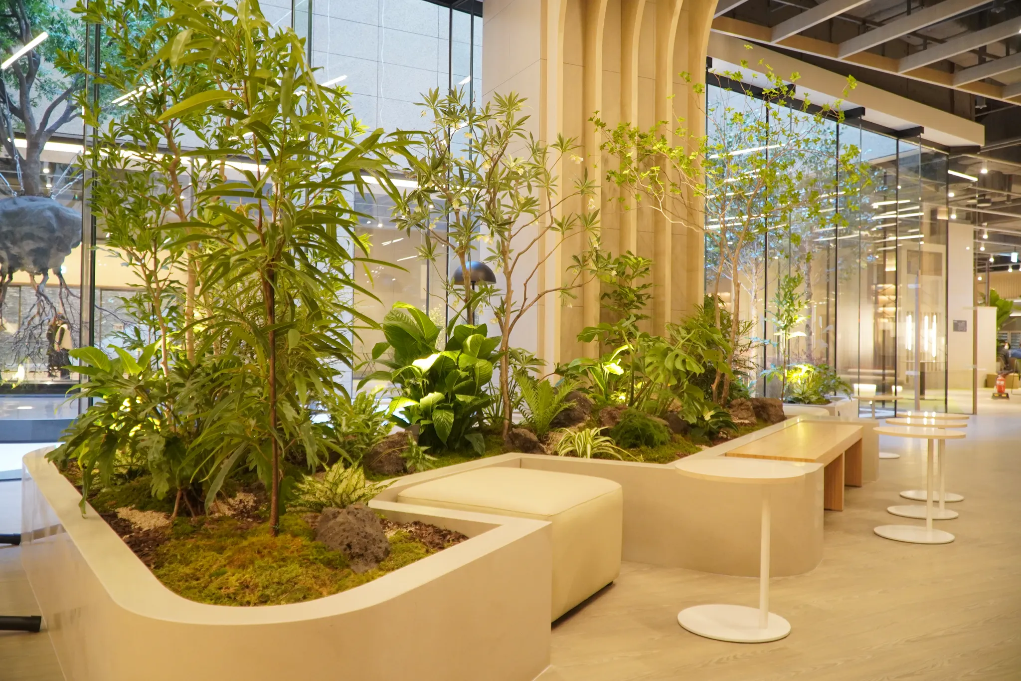 아웃도어 라운지 외에도, 내부의 그린케어존에서는 자연과의 교감을 통해 심리적 안정감을 제공한다는 의도 하에, 원시림을 재연하여 그린케어 효과를 극대화 하였습니다.