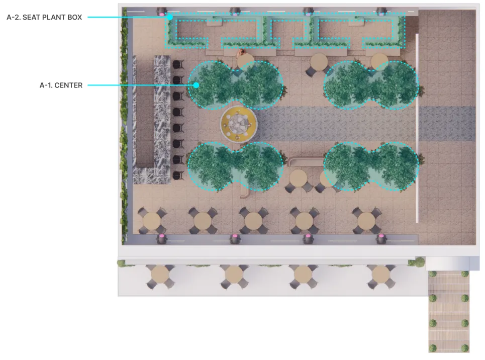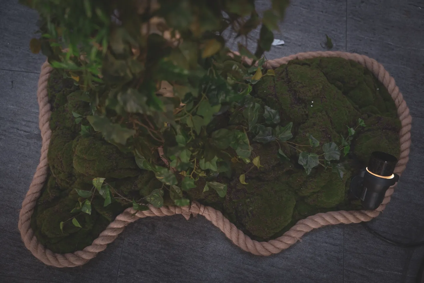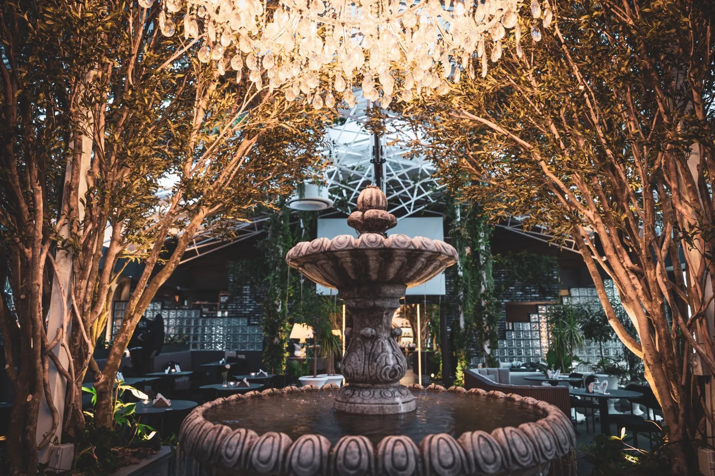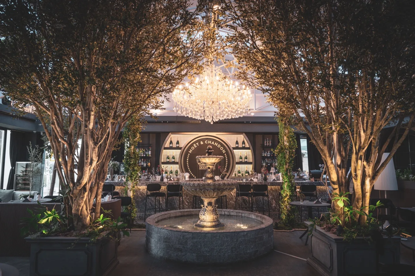 분수를 중심으로 높게 뻗은 나무이 천장까지 여러 방향으로 뻗어있습니다. 가지 사이로 사람들이 행복한 웃음을 보이며 서로의 이야기를 나누고 있습니다. 생화와 조화를 활용해 연출해 정돈되어있지만 정돈되지 않은 자연을 표현했습니다.