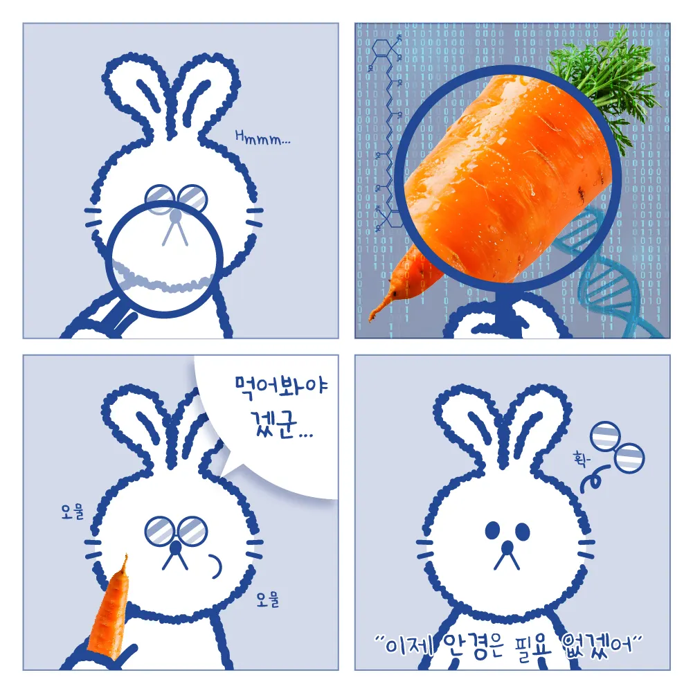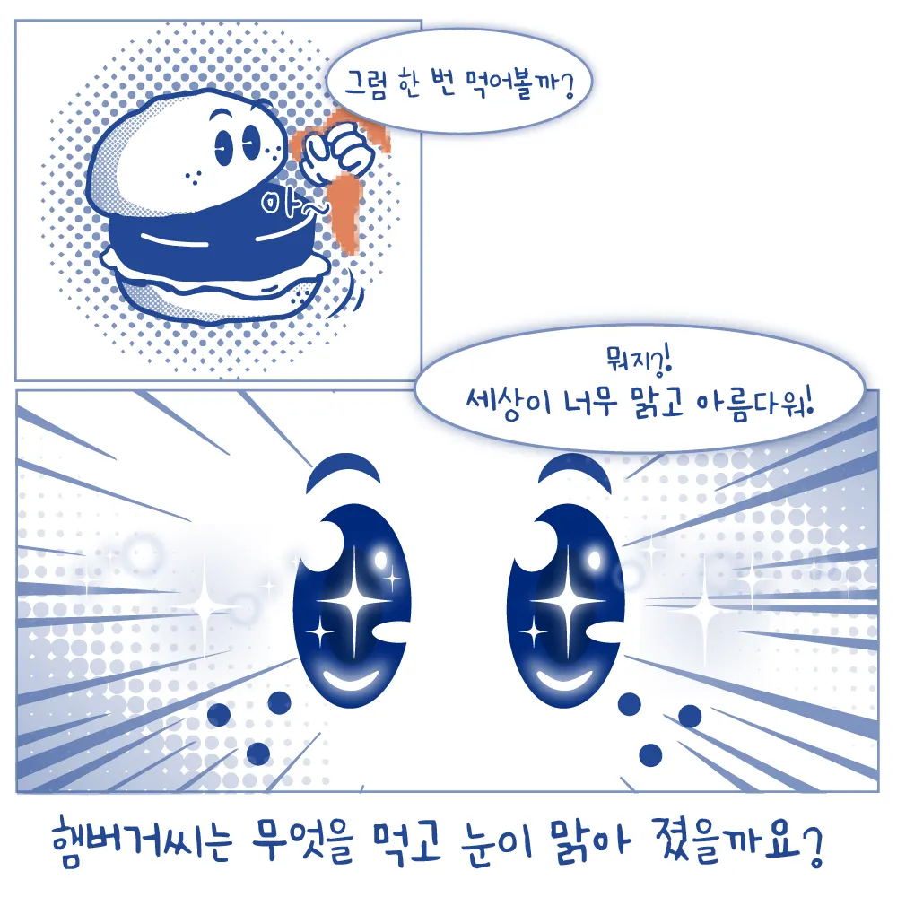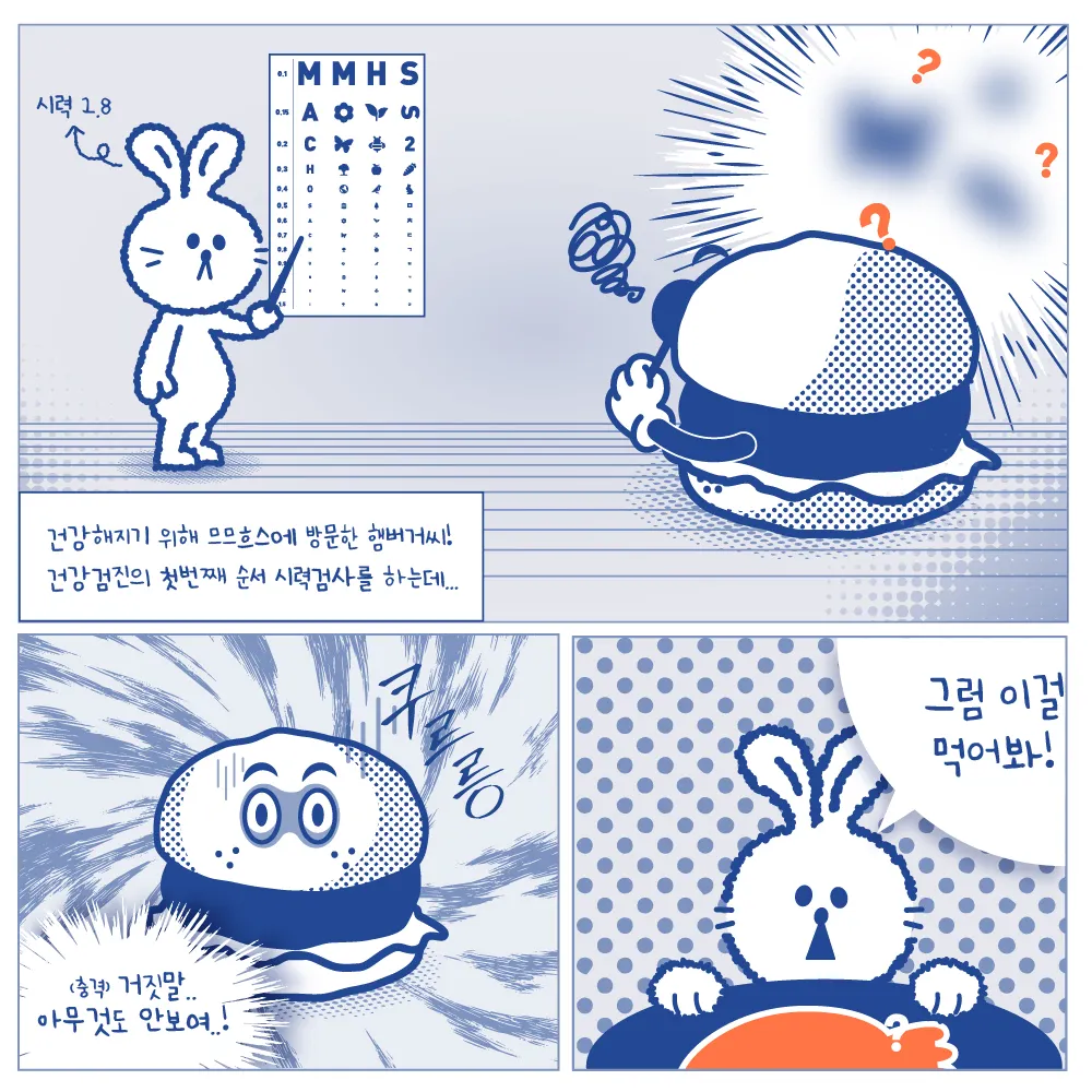당근라페를 활용한 ㅁㅊㄷㄱ버거는 ‘건강’과 ‘시력’에 초점을 맞춰 개발된 마초의사춘기만의 햄버거입니다. 건강을 사랑하는 토끼와 건강해지기 위해 노력하는 햄버거의 이야기를 친근하게 풀어 므므흐스에 방문하는 가족단위 고객들에게 쉽고 재미있게 다가가고자 했습니다.