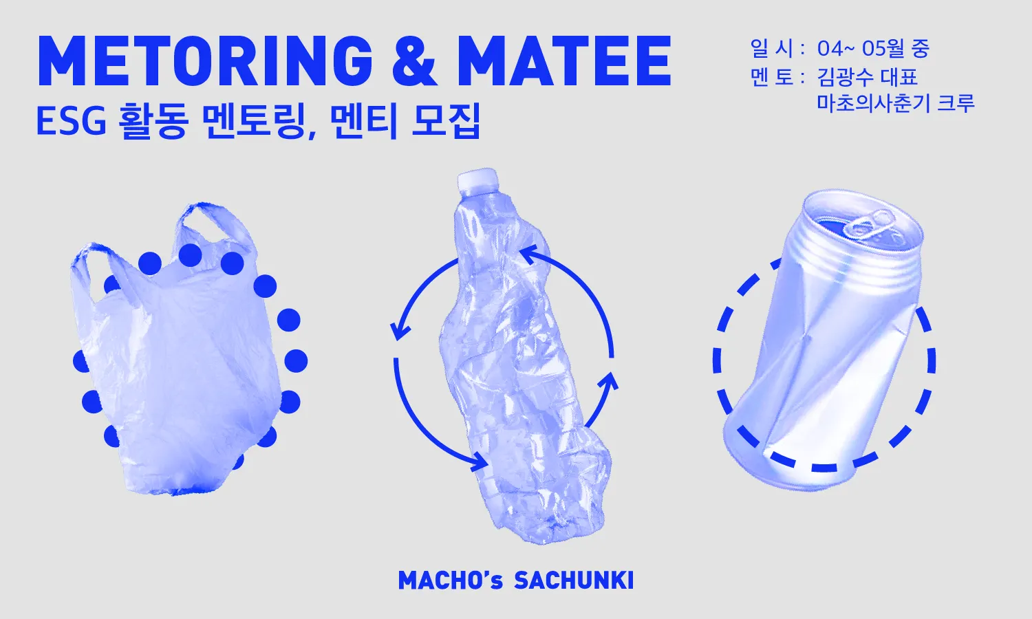 4/22일 지구의 날을 맞이하여 다양한 연령, 직업…환경에 대해 관심이 많은 분들과 맛있는 식사와 ESG 활동에 대한 마초의사춘기 ‘김광수대표님’과 직원들 멘토링을 진행하려고 합니다.
