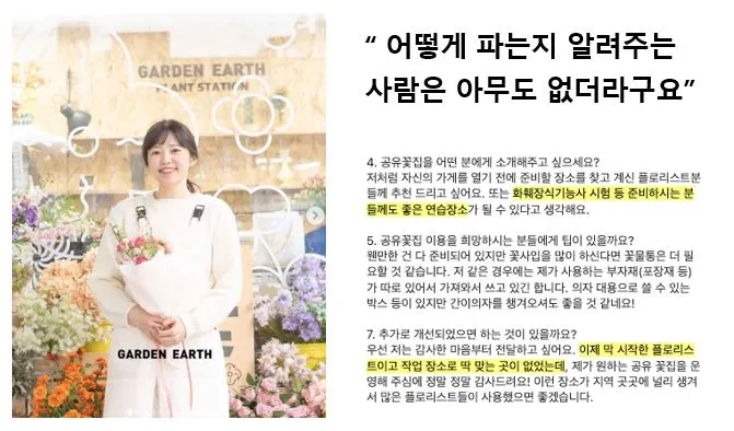 공유꽃집 : 꽃(식물) 관련 재료부터 집기들이 준비되어 있어 예비창업자, 플로리스트 등 창업을 준비하는 분들이 본인의 꽃집으로 한시적 운영해볼 수 있는 FLOWER SHARE PLACE